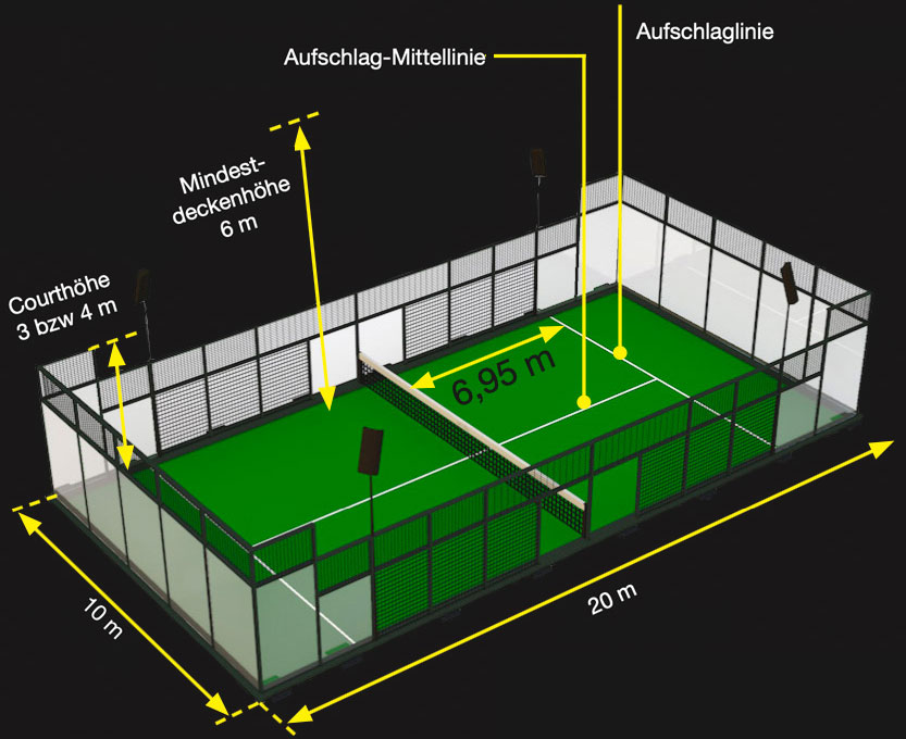 Ein Padelcourt ist 20 Meter lang und 10 Meter breit, wobei die Rückwände aus Glas bis zu einer Höhe von 3 Metern bestehen, während die Glasseitenwände nach 4 Metern enden. Die Wände sind meistens aus Glas. Der Rest des Platzes ist mit einem Stahl/Metallgitter bis zu einer Höhe von 4 Metern geschlossen.